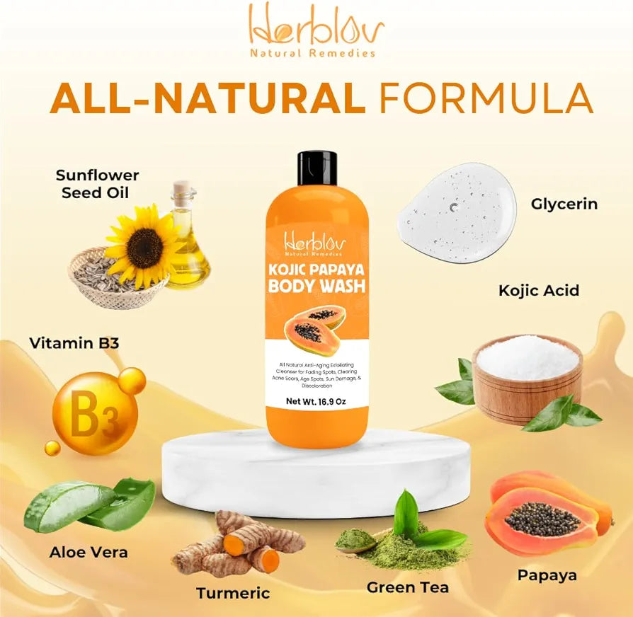 PURE KOJIC ACID BODYWASH: This all-natural ingredient is sourced from fermented rice, commonly used in Japanese sake. Kojic acid soap is a skincare extract known to assist with issues like melasma, age spots, sun damage, and discoloration.