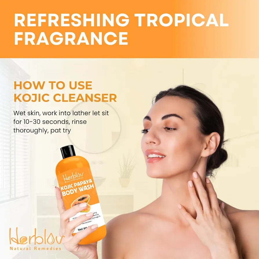 PAPAYA BODY WASH FOR BODY: This Kojic Papaya soap is designed to cleanse and brighten skin on the body, neck, inner thighs, underarms, and more. Safe and gentle for both men and women. Suitable for various areas like bikini, hands, armpits, breasts, and the body.